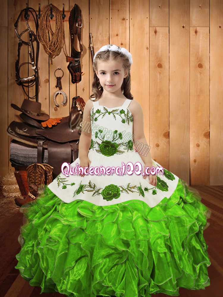 Neckline : StrapsShown Color : Spring GreenSilhouette : Ball GownsSleeve Length : sleevelessHemline : floor lengthBack Detail : Lace upFabric : OrganzaEmbellishment : Embroidery,RufflesOccasion : Sweet 16,QuinceaneraSeason : Spring,Summer,Fall,Winter