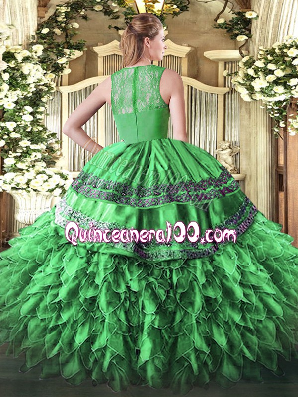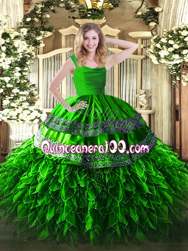 Neckline : StrapsShown Color : GreenSilhouette : Ball GownsSleeve Length : sleevelessHemline : floor lengthBack Detail : ZipperFabric : OrganzaEmbellishment : Beading,Lace,RufflesOccasion : Military Ball,Sweet 16,QuinceaneraSeason : Spring,Summer,Fall,Winter