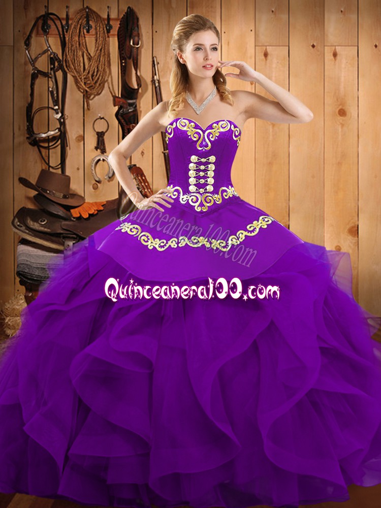 Neckline : SweetheartShown Color : PurpleSilhouette : Ball GownsSleeve Length : sleevelessHemline : floor lengthBack Detail : Lace upFabric : OrganzaEmbellishment : Embroidery,RufflesOccasion : Military Ball,Sweet 16,QuinceaneraSeason : Spring,Summer,Fall,Winter