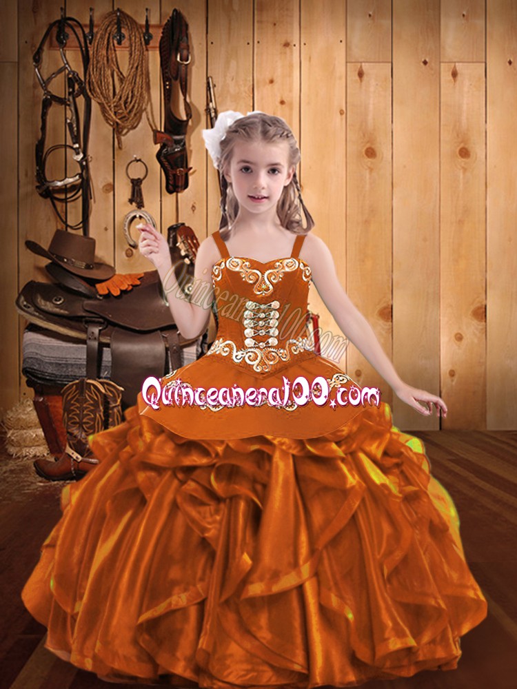 Neckline : StrapsShown Color : OrangeSilhouette : Ball GownsSleeve Length : sleevelessHemline : floor lengthBack Detail : Lace upFabric : OrganzaEmbellishment : Embroidery,RufflesOccasion : Party,Sweet 16,Quinceanera,Wedding PartySeason : Spring,Summer,Fall,Winter