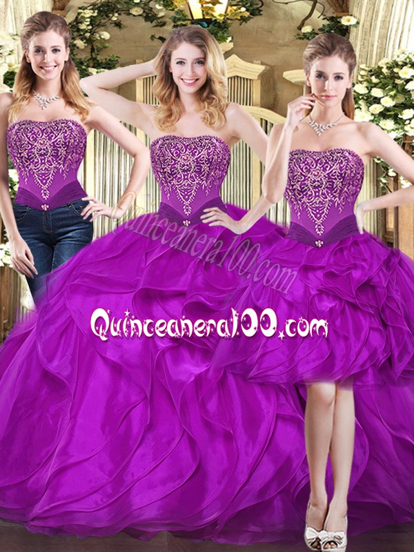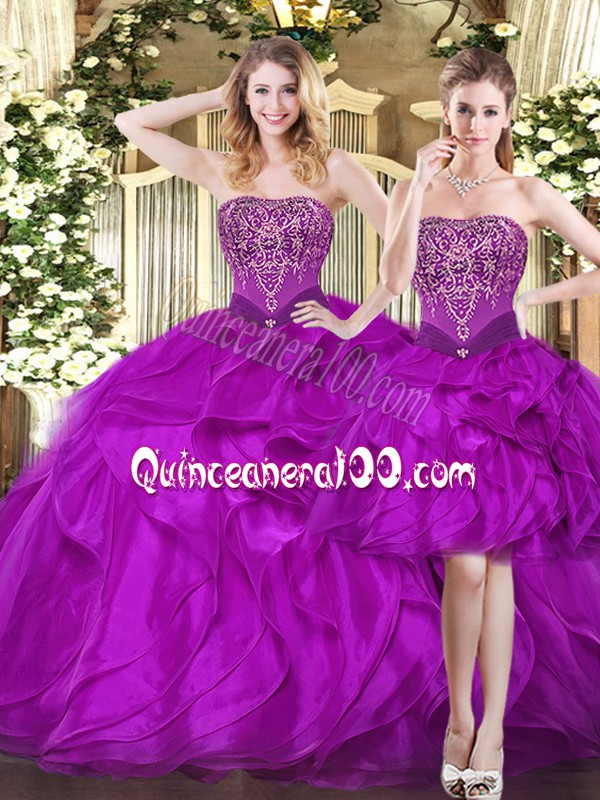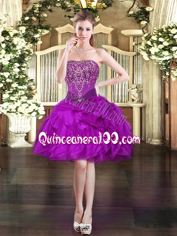 Neckline : StraplessShown Color : FuchsiaSilhouette : Ball GownsSleeve Length : sleevelessHemline : floor lengthBack Detail : Lace upFabric : TulleEmbellishment : Beading,RufflesOccasion : Military Ball,Sweet 16,QuinceaneraSeason : Spring,Summer,Fall,Winter