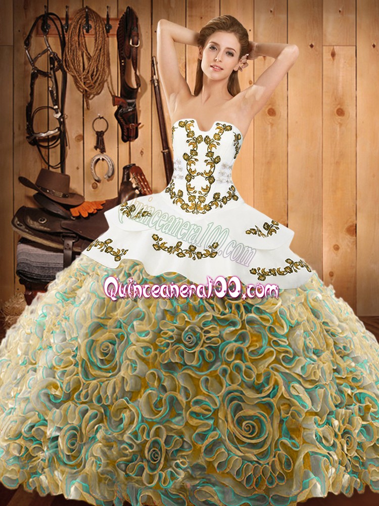 Neckline : StraplessShown Color : Multi-colorSilhouette : Ball GownsSleeve Length : sleevelessHemline : with trainBack Detail : Lace upFabric : Satin,Fabric With Rolling FlowersEmbellishment : EmbroideryOccasion : Military Ball,Sweet 16,QuinceaneraSeason : Spring,Summer,Fall,Winter