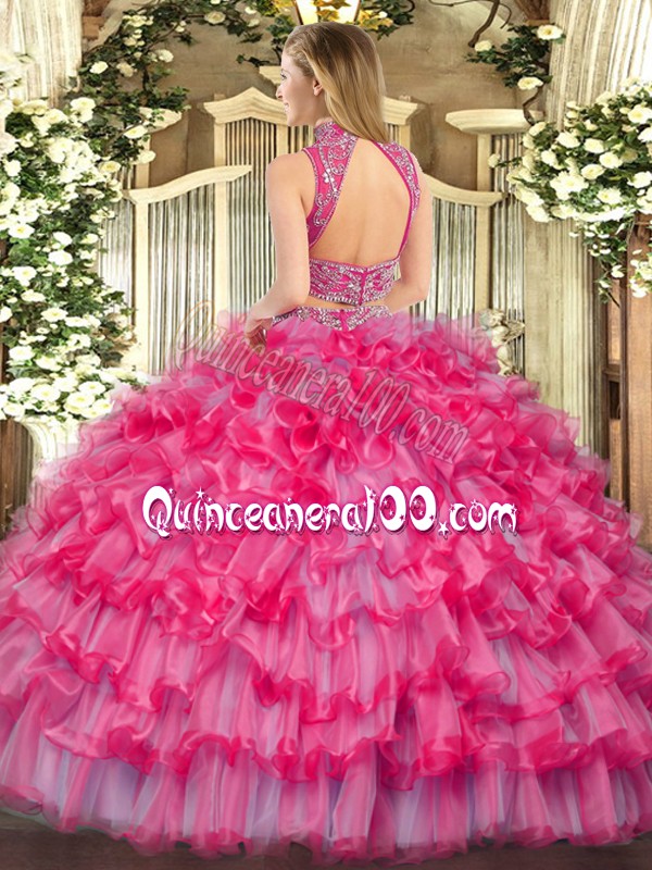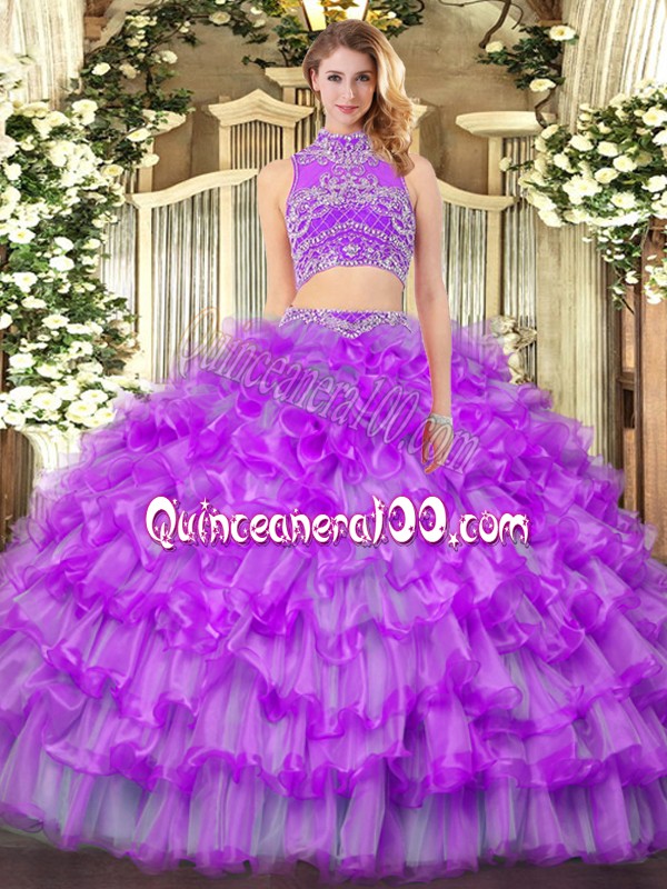 Neckline : High-neckShown Color : PurpleSilhouette : Two PiecesSleeve Length : sleevelessHemline : floor lengthBack Detail : BacklessFabric : TulleEmbellishment : Beading,Ruffled LayersOccasion : Military Ball,Sweet 16,Quinceanera,BeachSeason : Spring,Summer,Fall,Winter