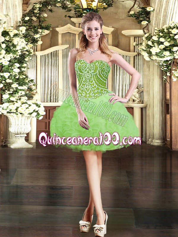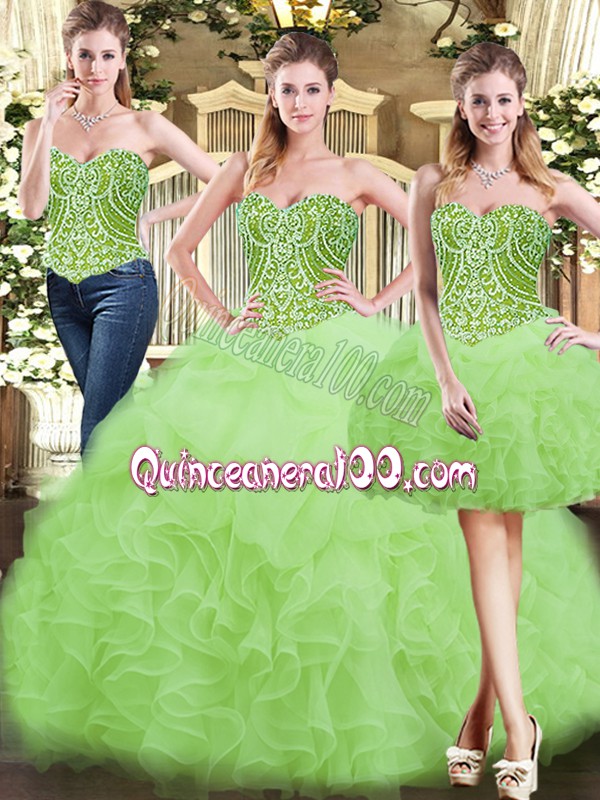 Neckline : SweetheartShown Color : Yellow GreenSilhouette : Ball GownsSleeve Length : sleevelessHemline : floor lengthBack Detail : Lace upFabric : OrganzaEmbellishment : Beading,RufflesOccasion : Military Ball,Sweet 16,QuinceaneraSeason : Spring,Summer,Fall,Winter