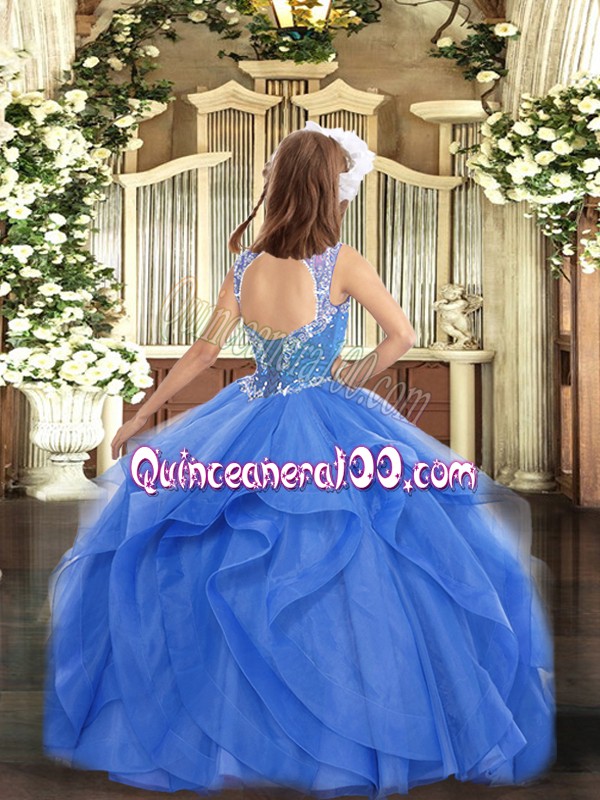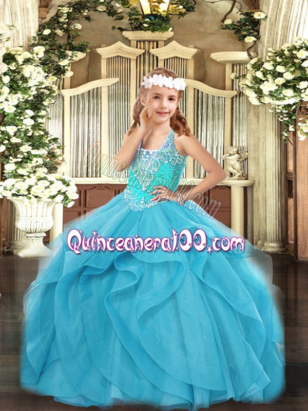 Neckline : StrapsShown Color : Aqua BlueSilhouette : Ball GownsSleeve Length : sleevelessHemline : floor lengthBack Detail : Lace upFabric : TulleEmbellishment : Beading,RufflesOccasion : Party,QuinceaneraSeason : Spring,Summer,Fall,Winter