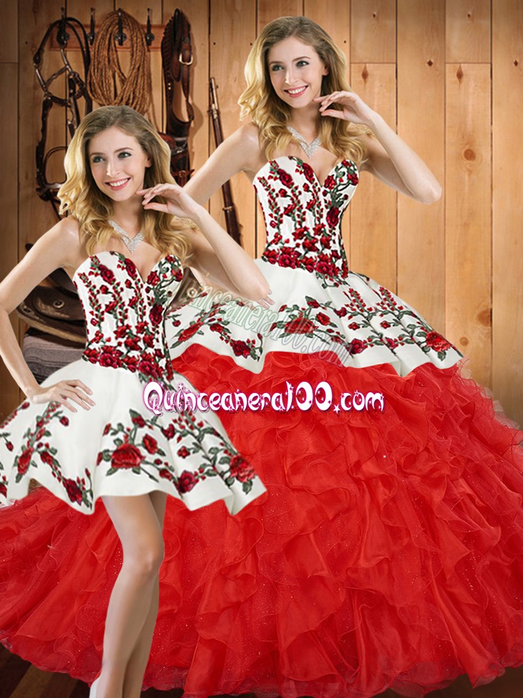 Neckline : SweetheartShown Color : RedSilhouette : Ball GownsSleeve Length : sleevelessHemline : floor lengthBack Detail : Lace upFabric : TulleEmbellishment : Embroidery,RufflesOccasion : Military Ball,Sweet 16,QuinceaneraSeason : Spring,Summer,Fall,Winter