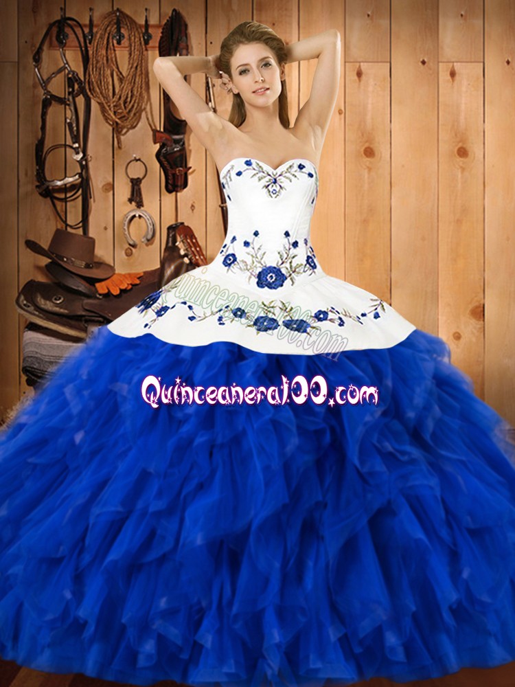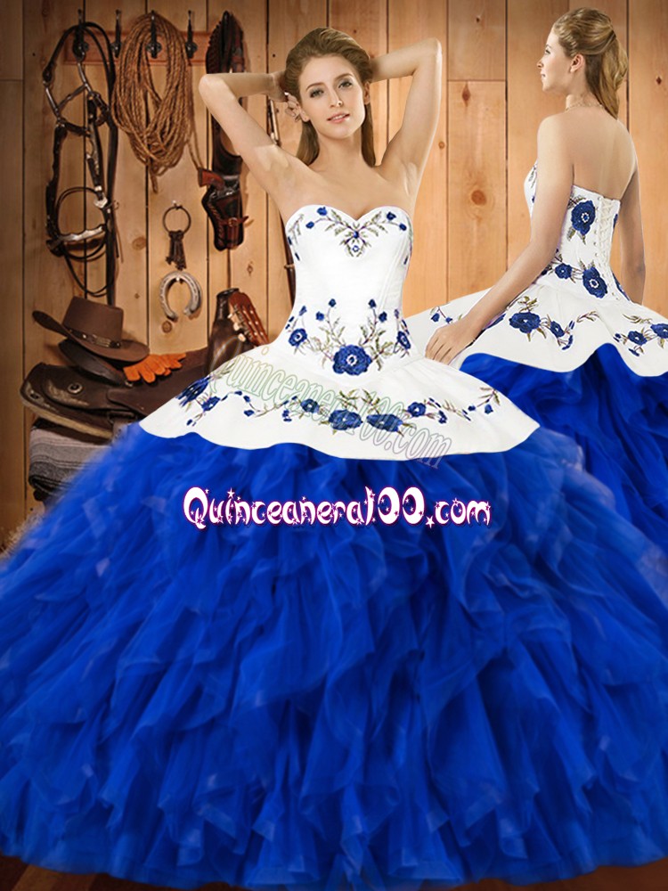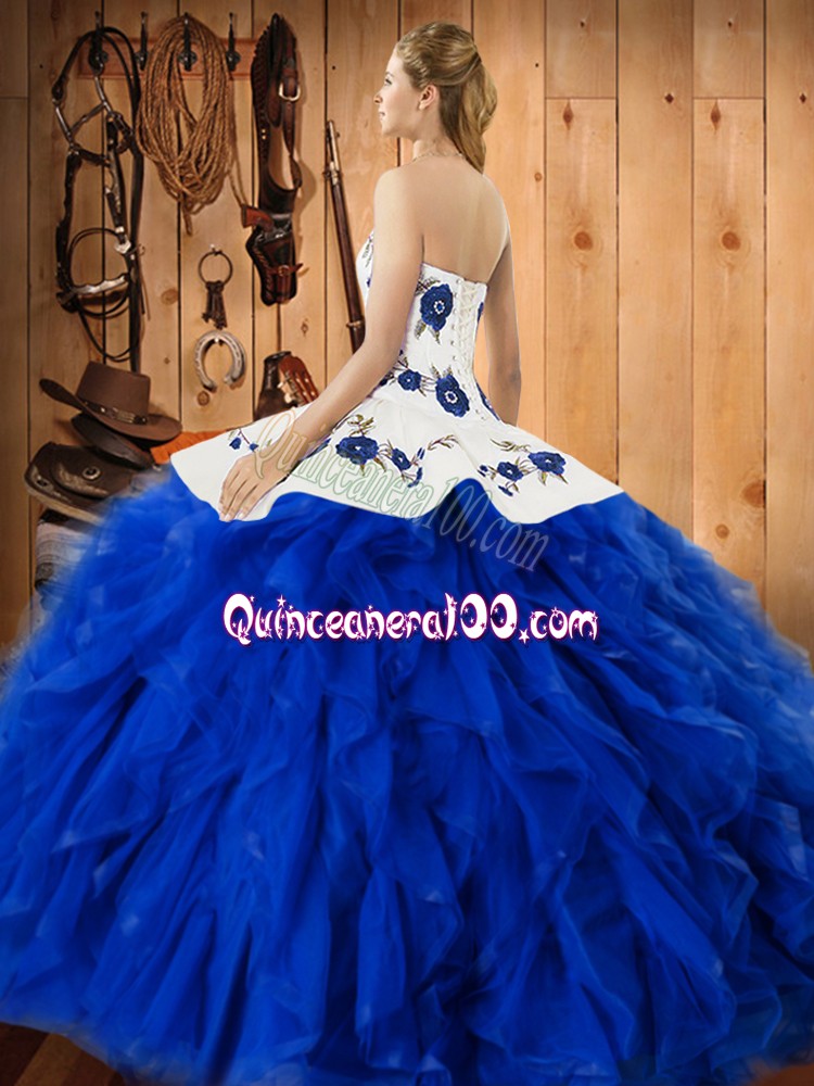 Neckline : Halter top Shown Color : Blue And White Silhouette : Ball Gowns Sleeve Length : sleeveless Hemline : floor length Back Detail : Lace up Fabric : Satin,Organza Embellishment : Embroidery,Ruffles Occasion : Military Ball,Sweet 16,Quinceanera Season : Spring,Summer,Fall,Winter