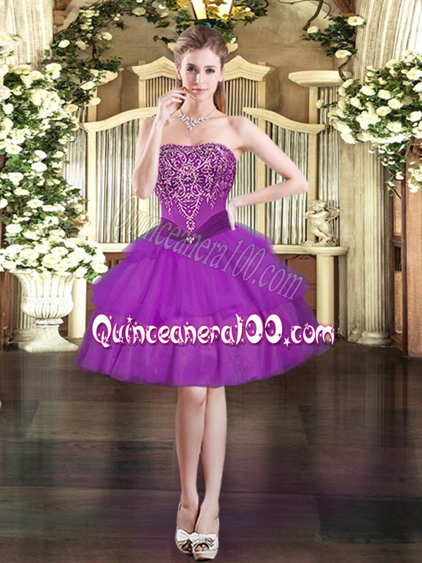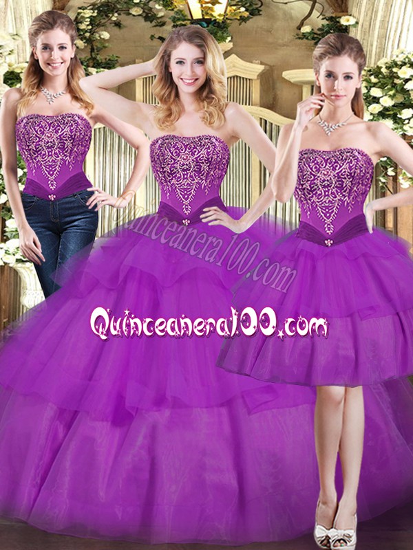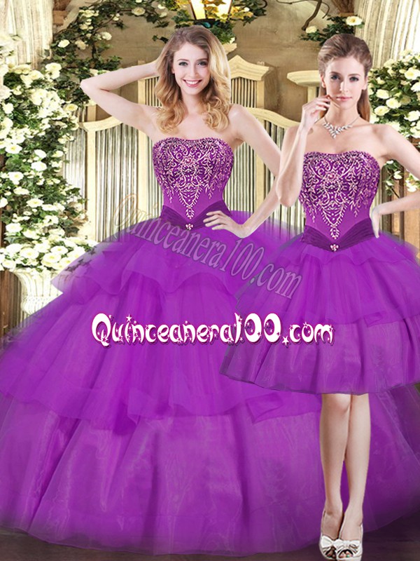 Neckline : StraplessShown Color : Eggplant PurpleSilhouette : Ball GownsSleeve Length : sleevelessHemline : floor lengthBack Detail : Lace upFabric : TulleEmbellishment : Beading,Ruffled LayersOccasion : Military Ball,Sweet 16,QuinceaneraSeason : Spring,Summer,Fall,Winter