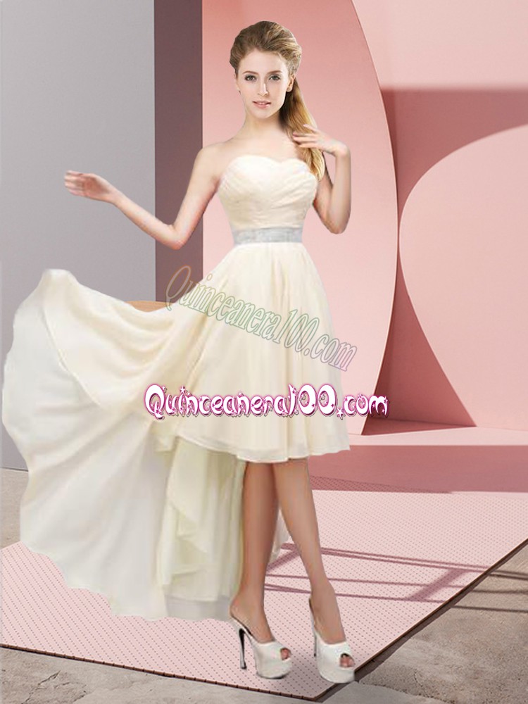 Neckline : SweetheartShown Color : ChampagneSilhouette : A-lineSleeve Length : sleevelessHemline : high lowBack Detail : Lace upFabric : ChiffonEmbellishment : BeadingOccasion : Prom,Party,Wedding PartySeason : Spring,Summer,Fall,Winter