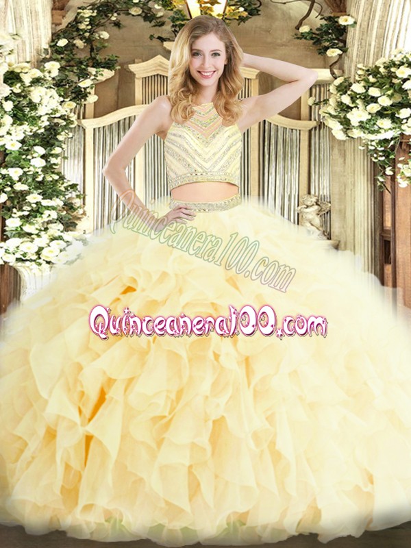 Neckline : ScoopShown Color : Light YellowSilhouette : Two PiecesSleeve Length : sleevelessHemline : floor lengthBack Detail : ZipperFabric : TulleEmbellishment : Beading,RufflesOccasion : Military Ball,Sweet 16,QuinceaneraSeason : Spring,Summer,Fall,Winter