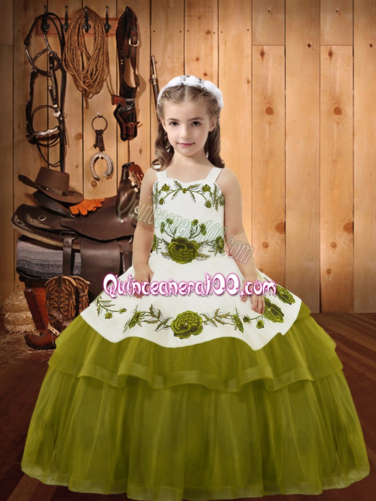 Neckline : StrapsShown Color : Olive GreenSilhouette : Ball GownsSleeve Length : sleevelessHemline : floor lengthBack Detail : Lace upFabric : OrganzaEmbellishment : Embroidery,Ruffled LayersOccasion : Sweet 16,QuinceaneraSeason : Spring,Summer,Fall,Winter