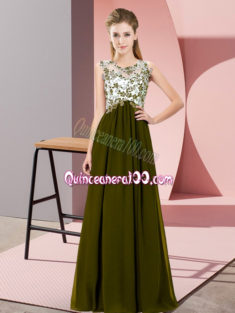 Neckline : ScoopShown Color : Olive GreenSilhouette : EmpireSleeve Length : sleevelessHemline : floor lengthBack Detail : ZipperFabric : ChiffonEmbellishment : Beading,AppliquesOccasion : Wedding PartySeason : Spring,Summer,Fall,Winter