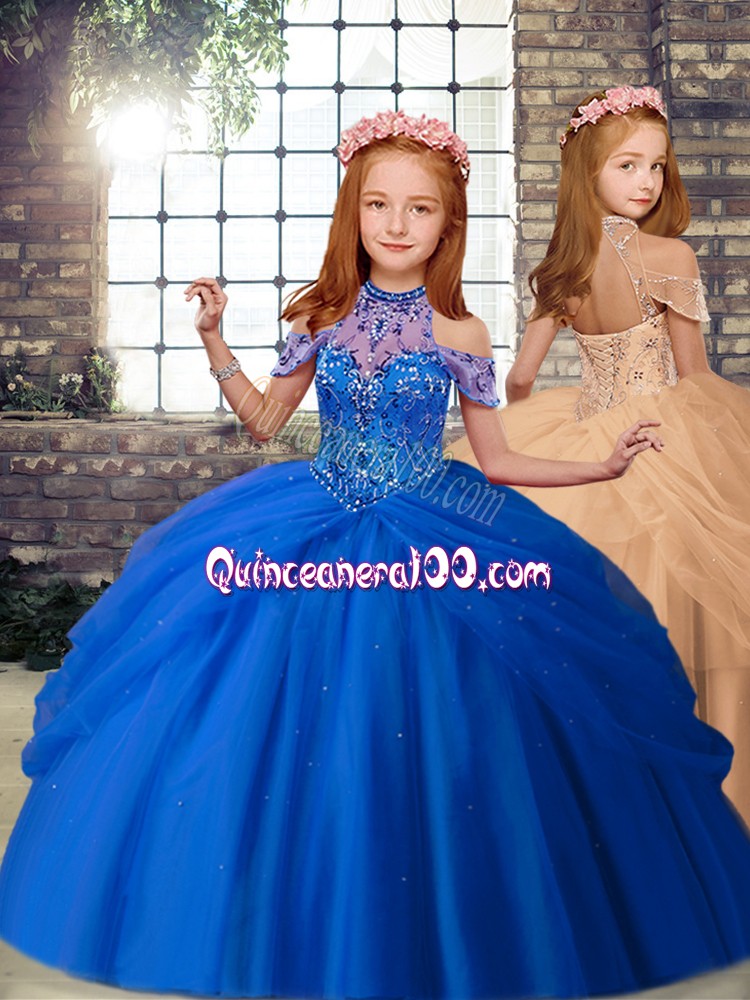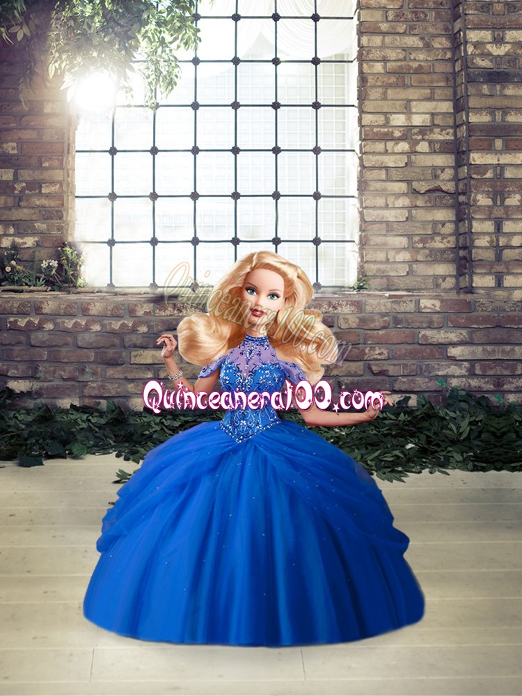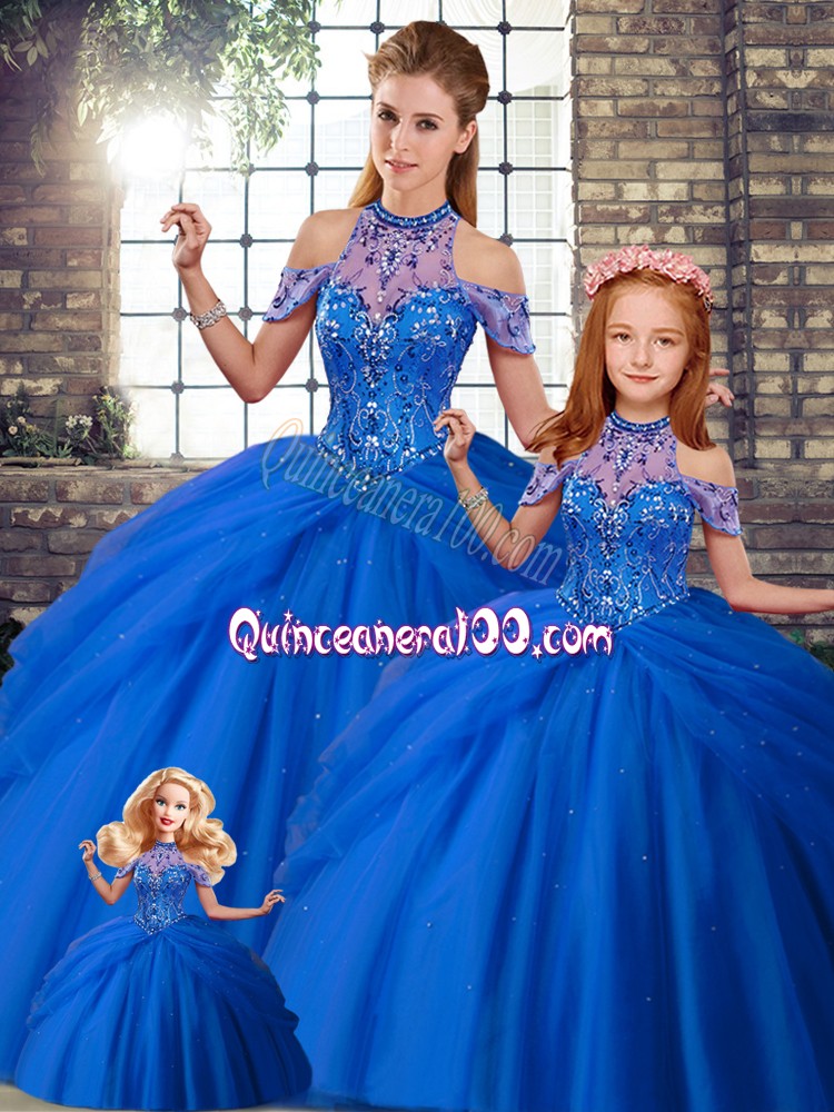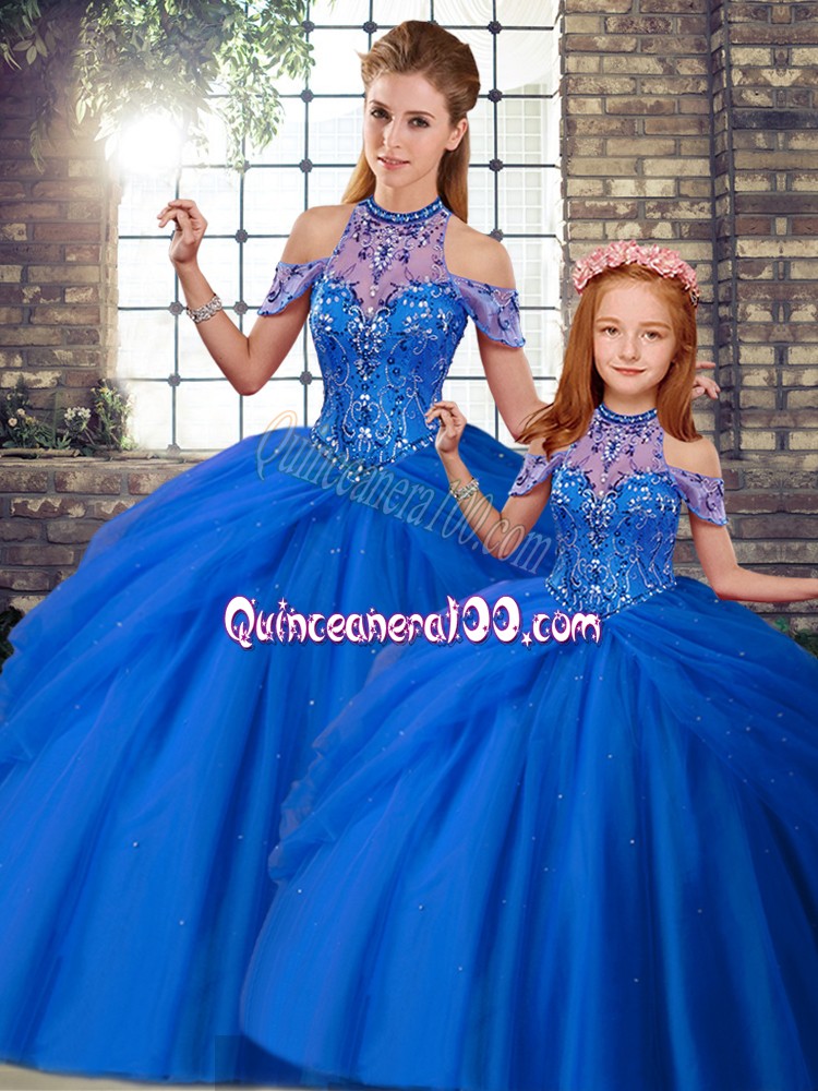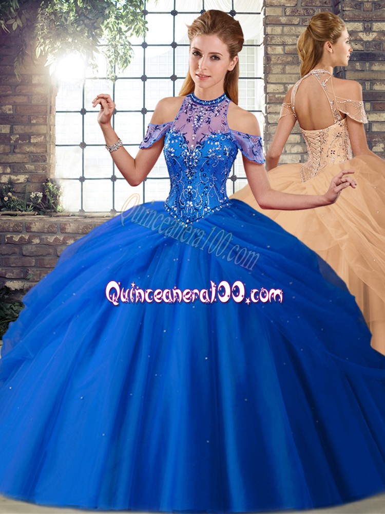Neckline : Halter topShown Color : BlueSilhouette : Ball GownsSleeve Length : sleevelessBack Detail : Lace upFabric : TulleEmbellishment : Beading,Pick UpsOccasion : Military Ball,Sweet 16,QuinceaneraSeason : Spring,Summer,Fall,Winter