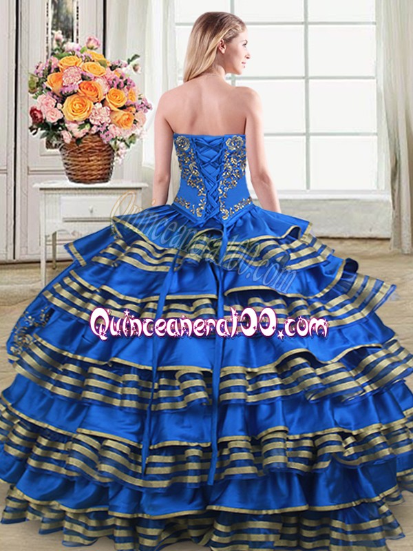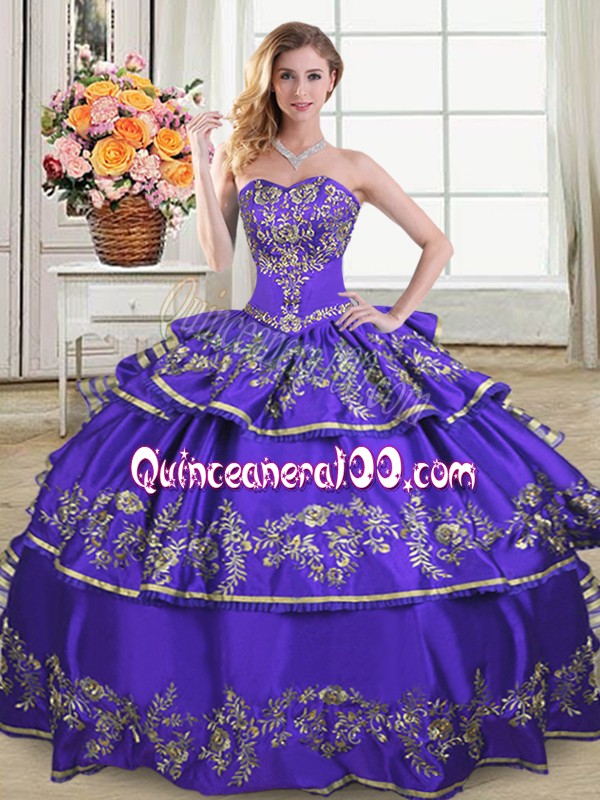 Neckline : SweetheartShown Color : PurpleSilhouette : Ball GownsSleeve Length : sleevelessHemline : floor lengthBack Detail : Lace upFabric : Satin,OrganzaEmbellishment : Embroidery,Ruffled LayersOccasion : Sweet 16,QuinceaneraSeason : Spring,Summer,Fall,Winter