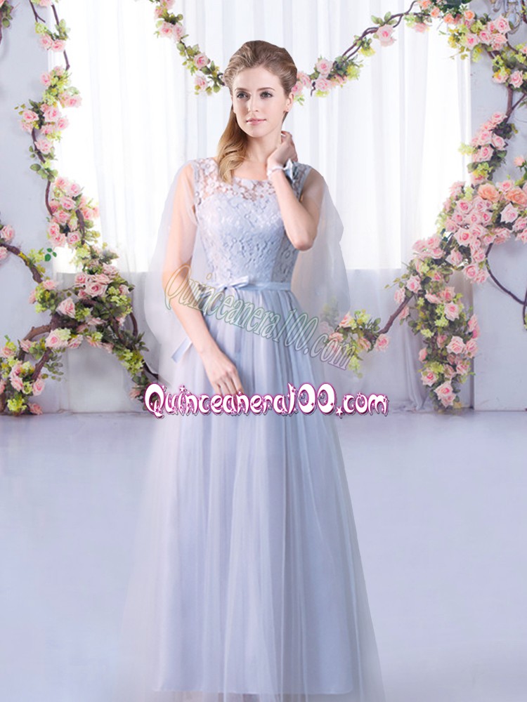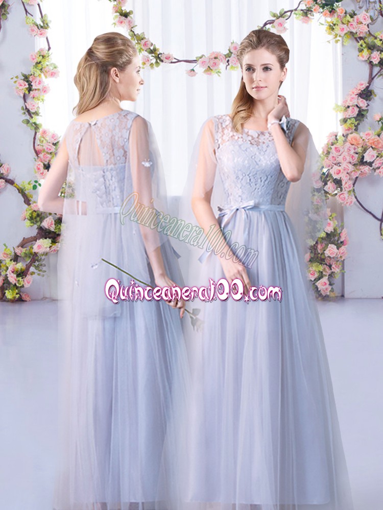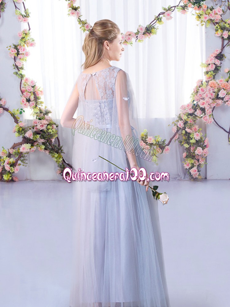 Neckline : ScoopShown Color : GreySilhouette : EmpireSleeve Length : sleevelessHemline : floor lengthBack Detail : Lace upFabric : TulleEmbellishment : LaceOccasion : Wedding PartySeason : Spring,Summer,Fall,Winter