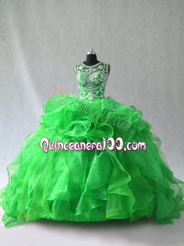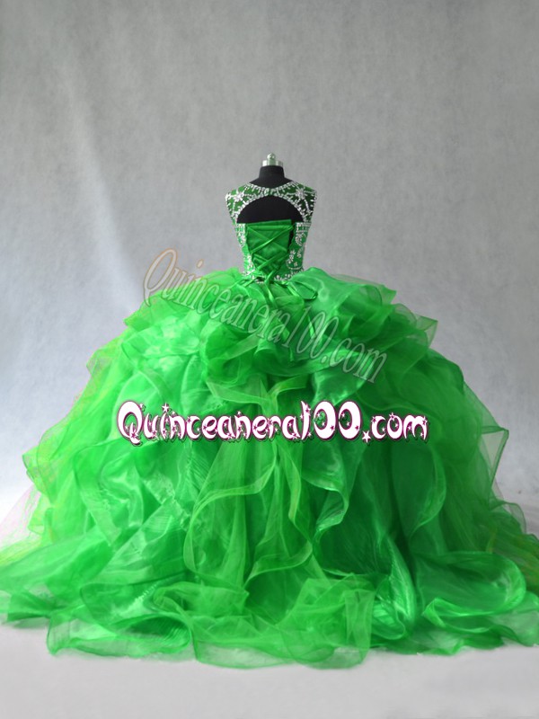 Neckline : ScoopShown Color : GreenSilhouette : Ball GownsSleeve Length : sleevelessBack Detail : Lace upFabric : OrganzaEmbellishment : Beading,RufflesOccasion : Sweet 16,QuinceaneraSeason : Spring,Summer,Fall,Winter