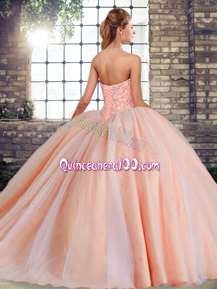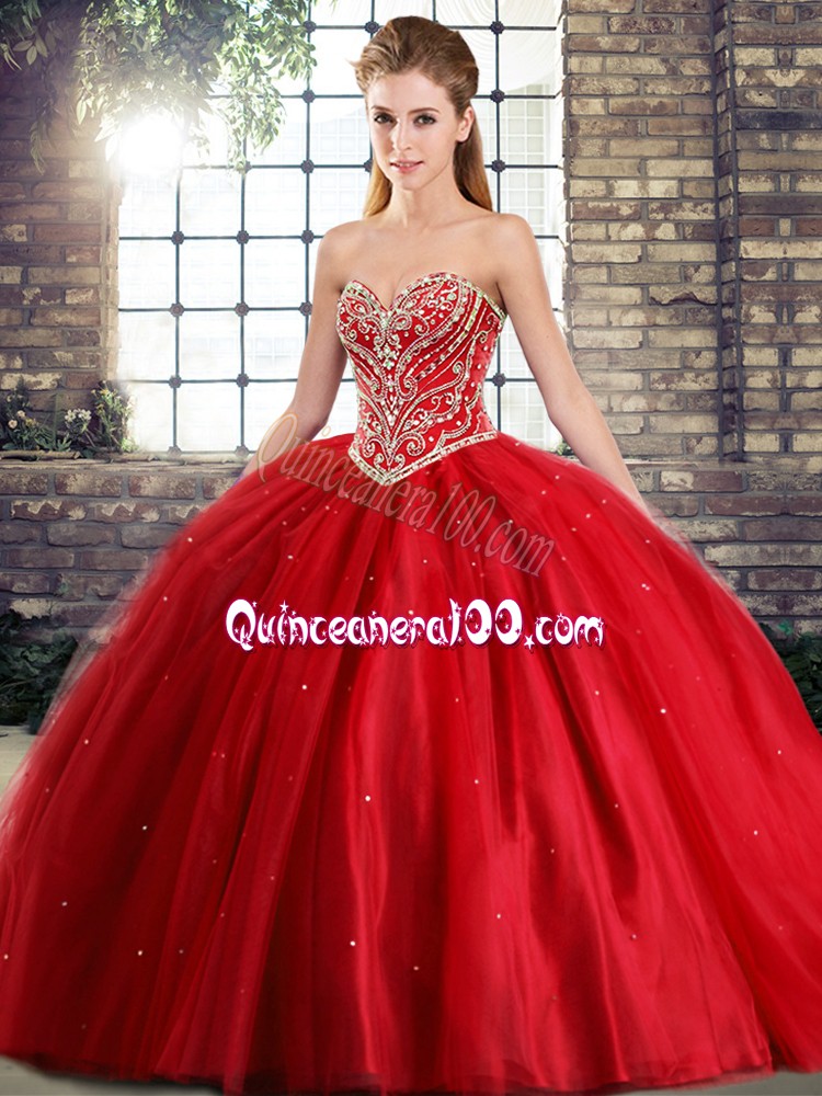 Neckline : SweetheartShown Color : RedSilhouette : Ball GownsSleeve Length : sleevelessBack Detail : Lace upFabric : TulleEmbellishment : BeadingOccasion : Military Ball,Sweet 16,QuinceaneraSeason : Spring,Summer,Fall,Winter