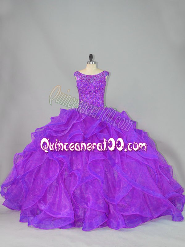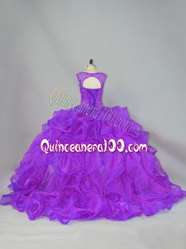 Neckline : ScoopShown Color : PurpleSilhouette : Ball GownsSleeve Length : sleevelessBack Detail : Lace upFabric : OrganzaEmbellishment : Beading,RufflesOccasion : Sweet 16,QuinceaneraSeason : Spring,Summer,Fall,Winter