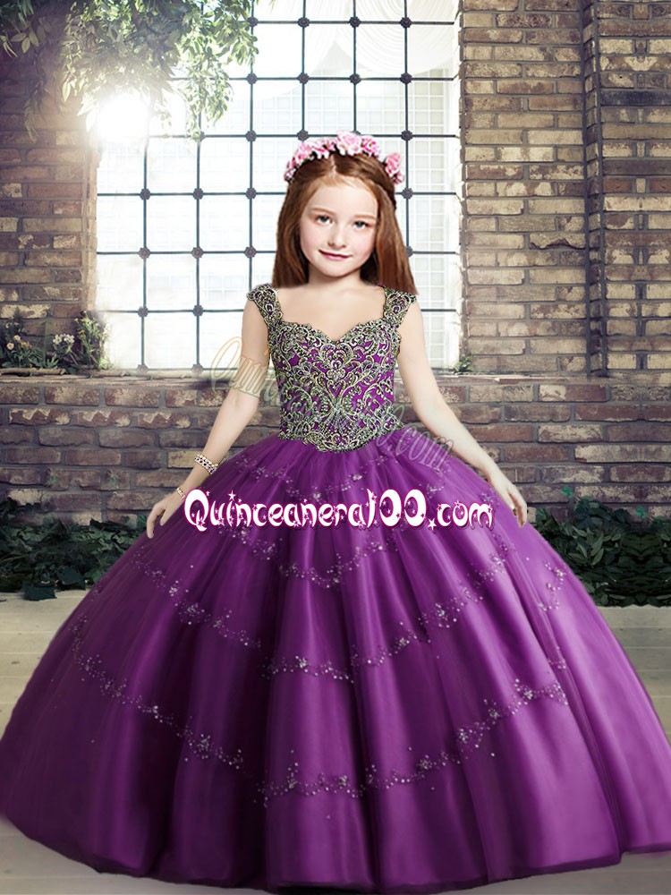 Neckline : StrapsShown Color : PurpleSilhouette : Ball GownsSleeve Length : sleevelessHemline : floor lengthBack Detail : Lace upFabric : TulleEmbellishment : BeadingOccasion : Party,Sweet 16,Wedding PartySeason : Spring,Summer,Fall,Winter