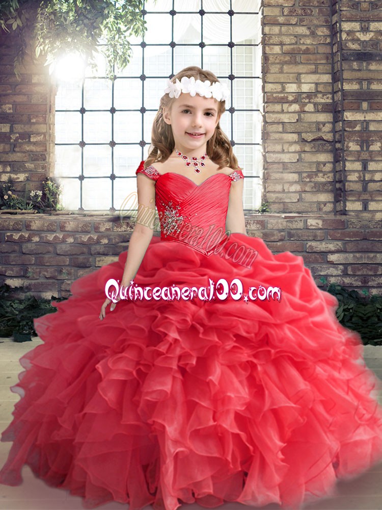 Neckline : StrapsShown Color : RedSilhouette : Ball GownsSleeve Length : sleevelessHemline : floor lengthBack Detail : Lace upFabric : OrganzaEmbellishment : BeadingOccasion : Party,Wedding PartySeason : Spring,Summer,Fall,Winter