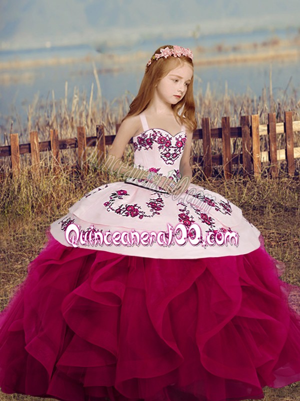 Neckline : StrapsShown Color : FuchsiaSilhouette : MermaidSleeve Length : sleevelessHemline : floor lengthBack Detail : Lace upEmbellishment : Embroidery,RufflesOccasion : Party,Sweet 16,Wedding PartySeason : Spring,Summer,Fall,Winter