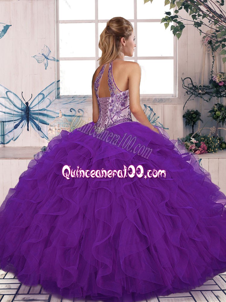 Neckline : Halter topShown Color : PurpleSilhouette : Ball GownsSleeve Length : sleevelessHemline : floor lengthBack Detail : Lace upFabric : TulleEmbellishment : Beading,RufflesOccasion : Military Ball,Sweet 16,QuinceaneraSeason : Spring,Summer,Fall,Winter