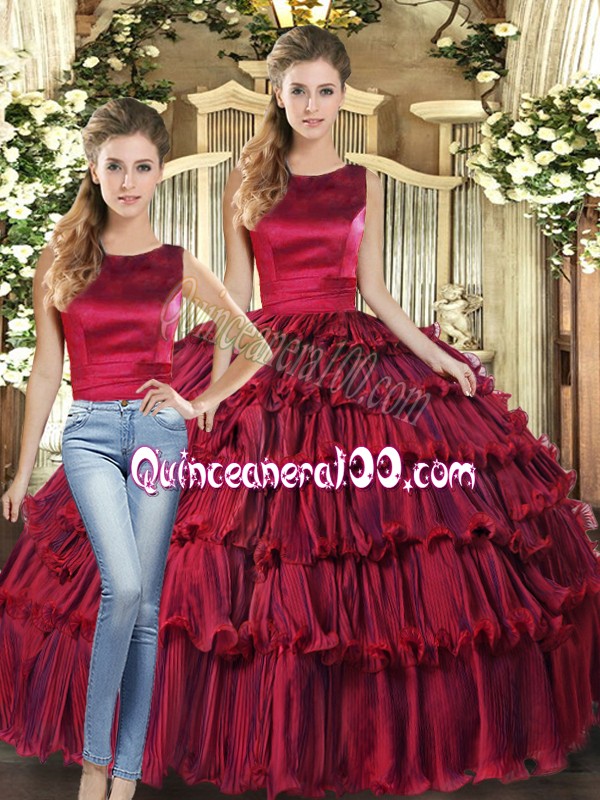 Neckline : ScoopShown Color : Wine RedSilhouette : Two PiecesSleeve Length : sleevelessHemline : floor lengthBack Detail : Lace upFabric : OrganzaEmbellishment : Ruffled LayersOccasion : Military Ball,Sweet 16,QuinceaneraSeason : Spring,Summer,Fall,Winter