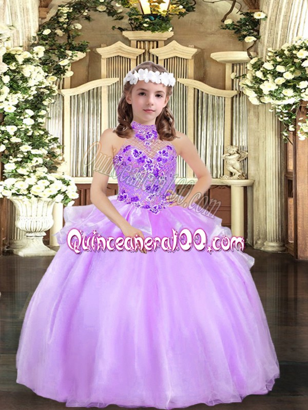 Neckline : Halter topShown Color : LavenderSilhouette : Ball GownsSleeve Length : sleevelessHemline : floor lengthBack Detail : Lace upFabric : OrganzaEmbellishment : AppliquesOccasion : Party,Wedding PartySeason : Spring,Summer,Fall,Winter