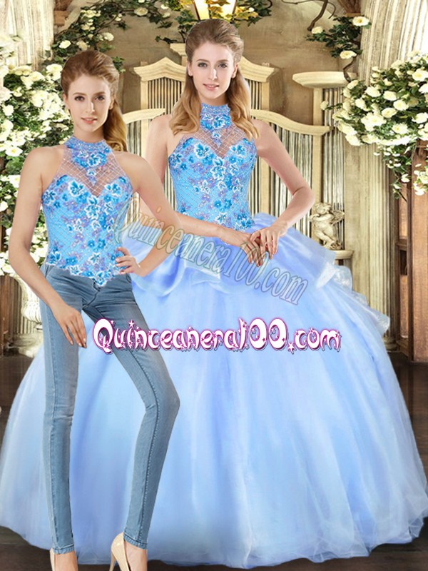 Neckline : Halter topShown Color : BlueSilhouette : Ball GownsSleeve Length : sleevelessHemline : floor lengthBack Detail : Lace upFabric : OrganzaEmbellishment : EmbroideryOccasion : Military Ball,Sweet 16,QuinceaneraSeason : Spring,Summer,Fall,Winter