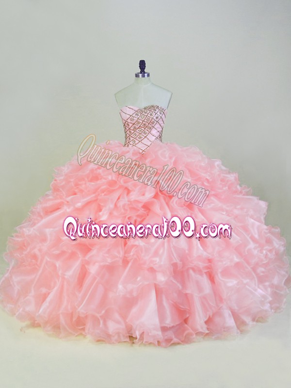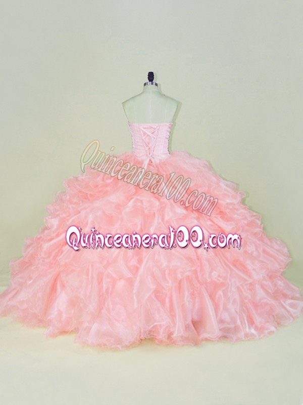 Neckline : SweetheartShown Color : PeachSilhouette : Ball GownsSleeve Length : sleevelessBack Detail : Lace upFabric : OrganzaEmbellishment : Beading,RufflesOccasion : Sweet 16,QuinceaneraSeason : Spring,Summer,Fall,Winter
