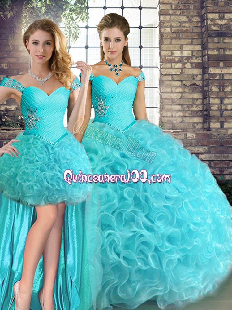 Neckline : Off the shoulder Shown Color : Aqua Blue Silhouette : Three Pieces Sleeve Length : sleeveless Hemline : floor length Back Detail : Lace up Fabric : Fabric With Rolling Flowers Embellishment : Beading Occasion : Military Ball,Sweet 16,Quinceanera Season : Spring,Summer,Fall,Winter