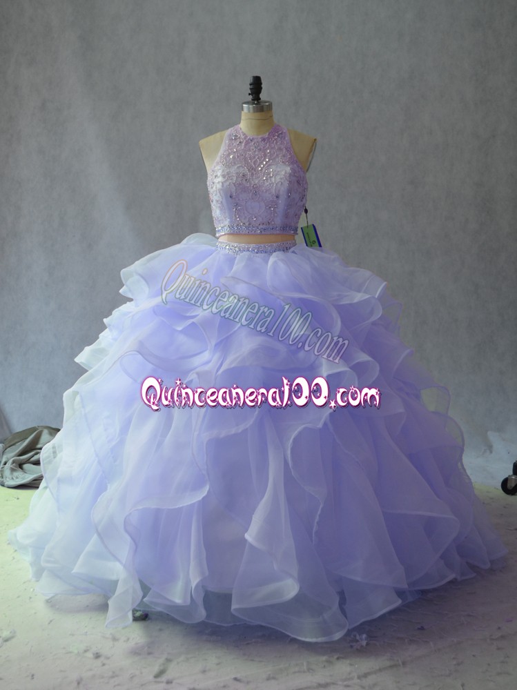 Neckline : Halter topShown Color : LavenderSilhouette : Two PiecesSleeve Length : sleevelessHemline : floor lengthBack Detail : BacklessFabric : OrganzaEmbellishment : Beading,RufflesOccasion : Sweet 16,QuinceaneraSeason : Spring,Summer,Fall,Winter