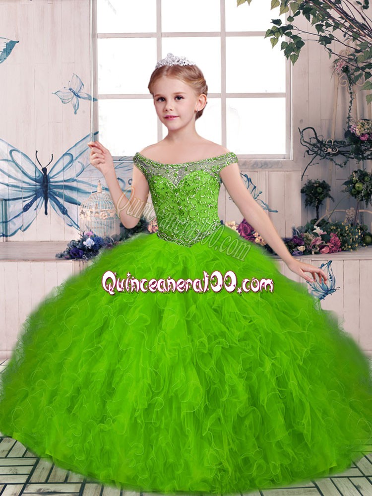 Neckline : Off the shoulder Shown Color : Spring Green Silhouette : Ball Gowns Sleeve Length : sleeveless Hemline : floor length Back Detail : Lace up Fabric : Tulle Embellishment : Beading,Ruffles Occasion : Party,Sweet 16,Wedding Party Season : Spring,Summer,Fall,Winter