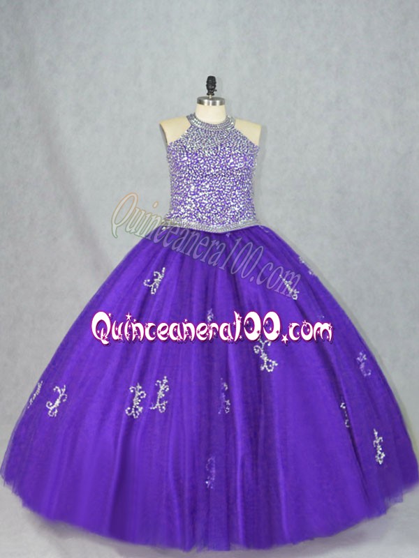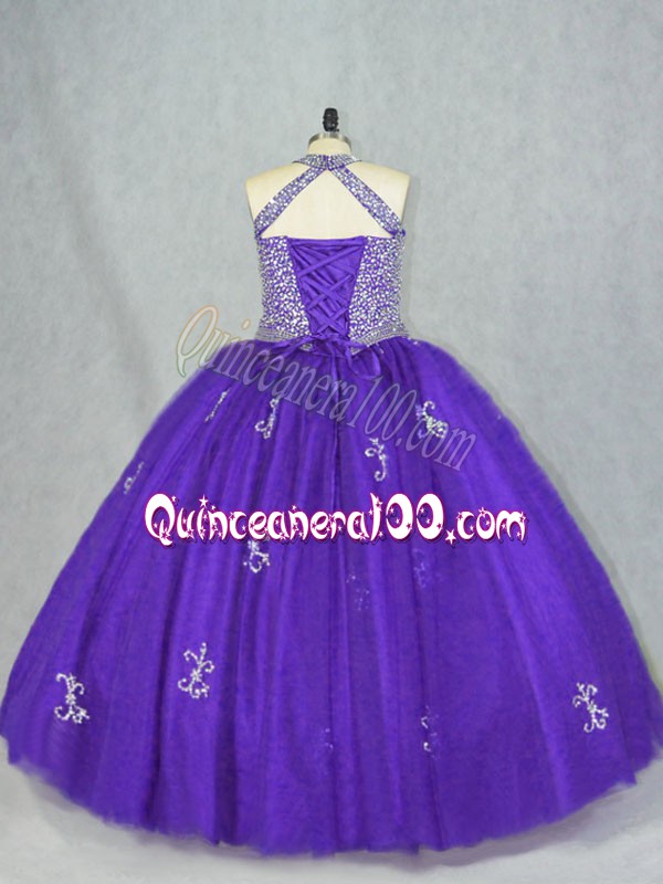 Neckline : Halter topShown Color : PurpleSilhouette : Ball GownsSleeve Length : sleevelessHemline : floor lengthBack Detail : Lace upFabric : TulleEmbellishment : Beading,AppliquesOccasion : Sweet 16,QuinceaneraSeason : Spring,Summer,Fall,Winter