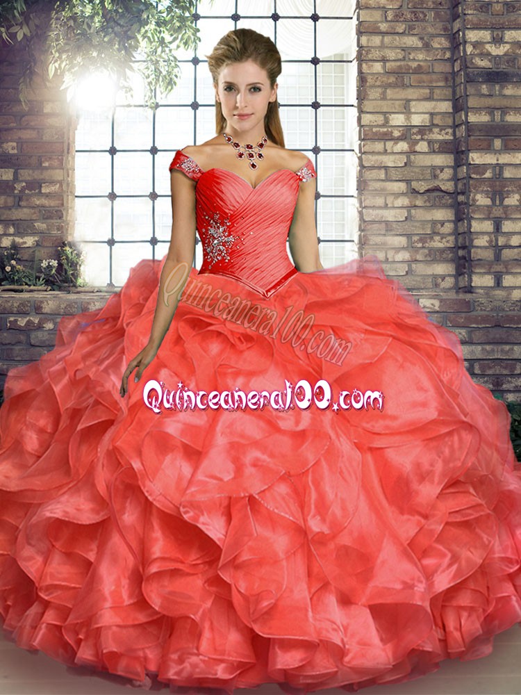 Neckline : Off the shoulderShown Color : Coral RedSilhouette : Ball GownsSleeve Length : sleevelessHemline : floor lengthBack Detail : Lace upFabric : OrganzaEmbellishment : Beading,RufflesOccasion : Military Ball,Sweet 16,QuinceaneraSeason : Spring,Summer,Fall,Winter