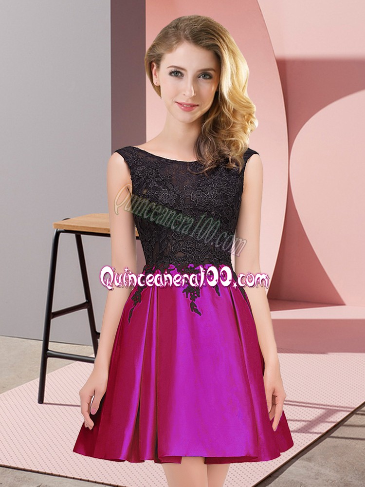 Neckline : ScoopShown Color : FuchsiaSilhouette : A-lineSleeve Length : sleevelessHemline : mini lengthBack Detail : ZipperFabric : SatinEmbellishment : LaceOccasion : Wedding PartySeason : Spring,Summer,Fall