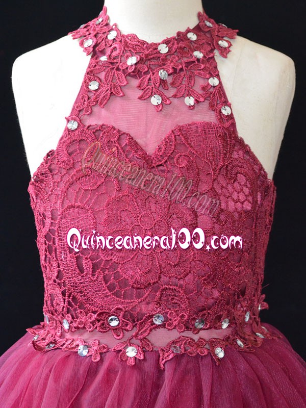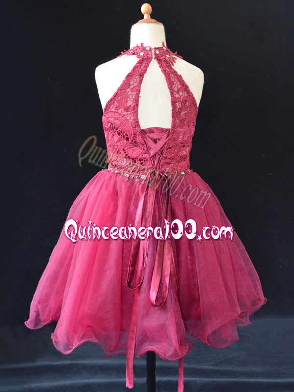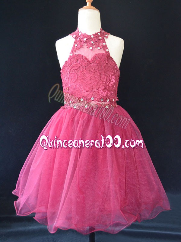 Chic Hot Pink A-line Halter Top Sleeveless Organza Mini Length Lace Up Beading and Lace Flower Girl Dresses