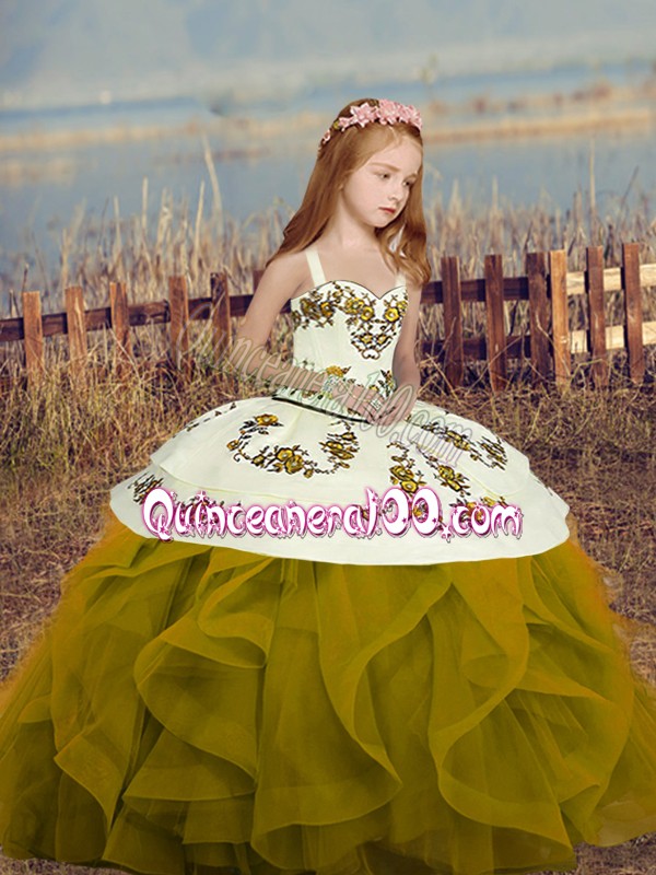 Neckline : StrapsShown Color : Olive GreenSilhouette : Ball GownsSleeve Length : sleevelessHemline : floor lengthBack Detail : Lace upEmbellishment : Embroidery,RufflesOccasion : Party,Wedding PartySeason : Spring,Summer,Fall,Winter