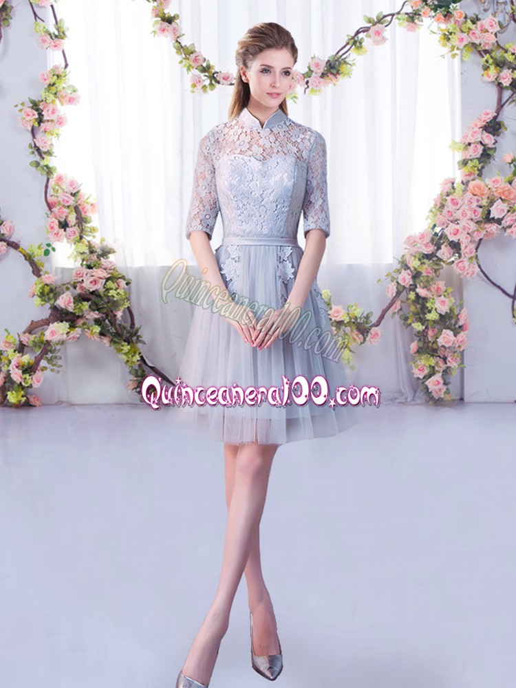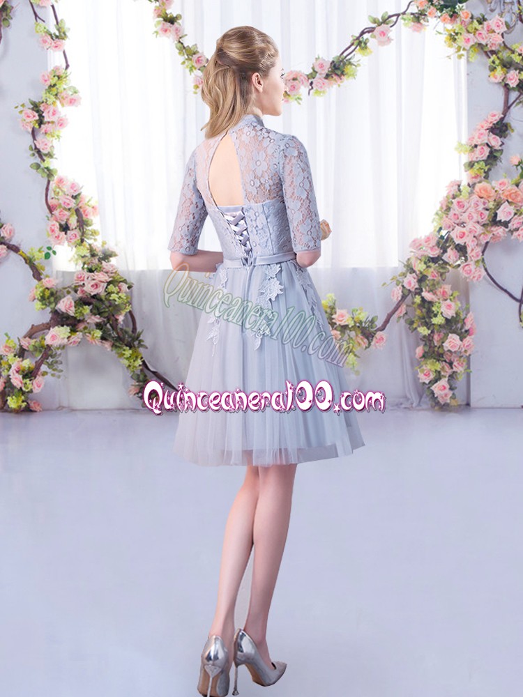 Neckline : High-neckShown Color : GreySilhouette : EmpireSleeve Length : half sleevesHemline : mini lengthBack Detail : Lace upEmbellishment : LaceOccasion : Wedding PartySeason : Spring,Summer,Fall