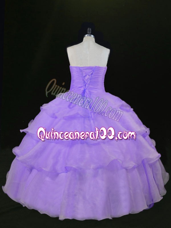 Shown Color : LavenderSilhouette : Ball GownsSleeve Length : sleevelessHemline : floor lengthFabric : OrganzaEmbellishment : Beading,RufflesOccasion : Sweet 16,QuinceaneraSeason : Spring,Summer,Fall,Winter