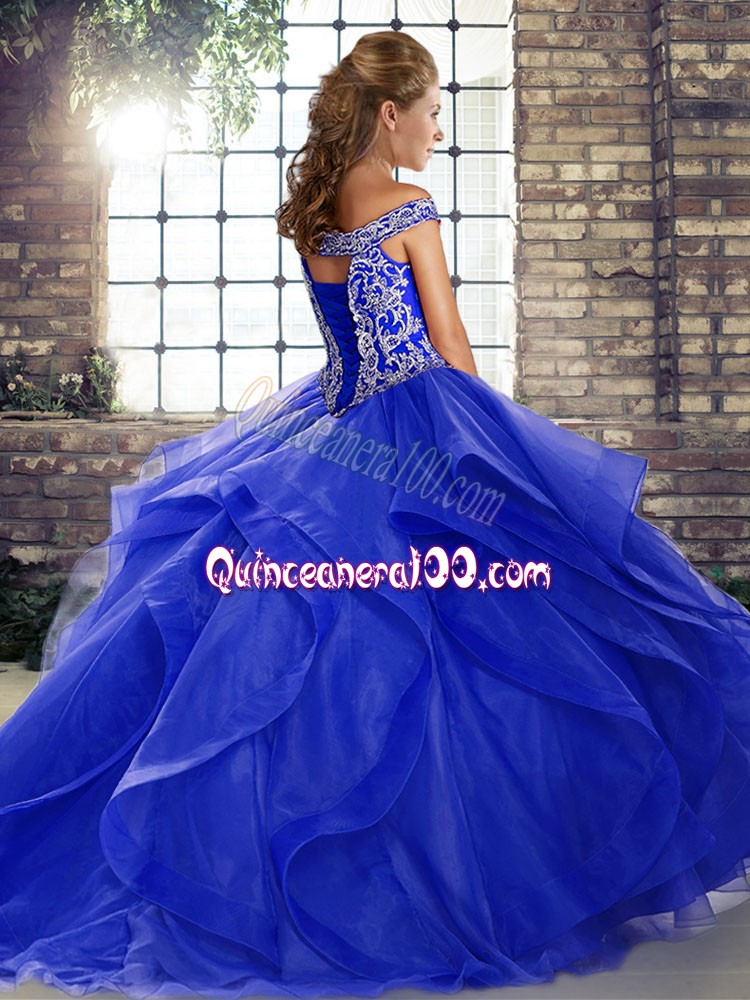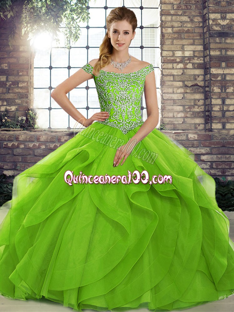 Simple Green Sweet 16 Quinceanera Dress Military Ball and Sweet 16 and Quinceanera with Beading and Ruffles Off The Shoulder Sleeveless Brush Train Lace Up