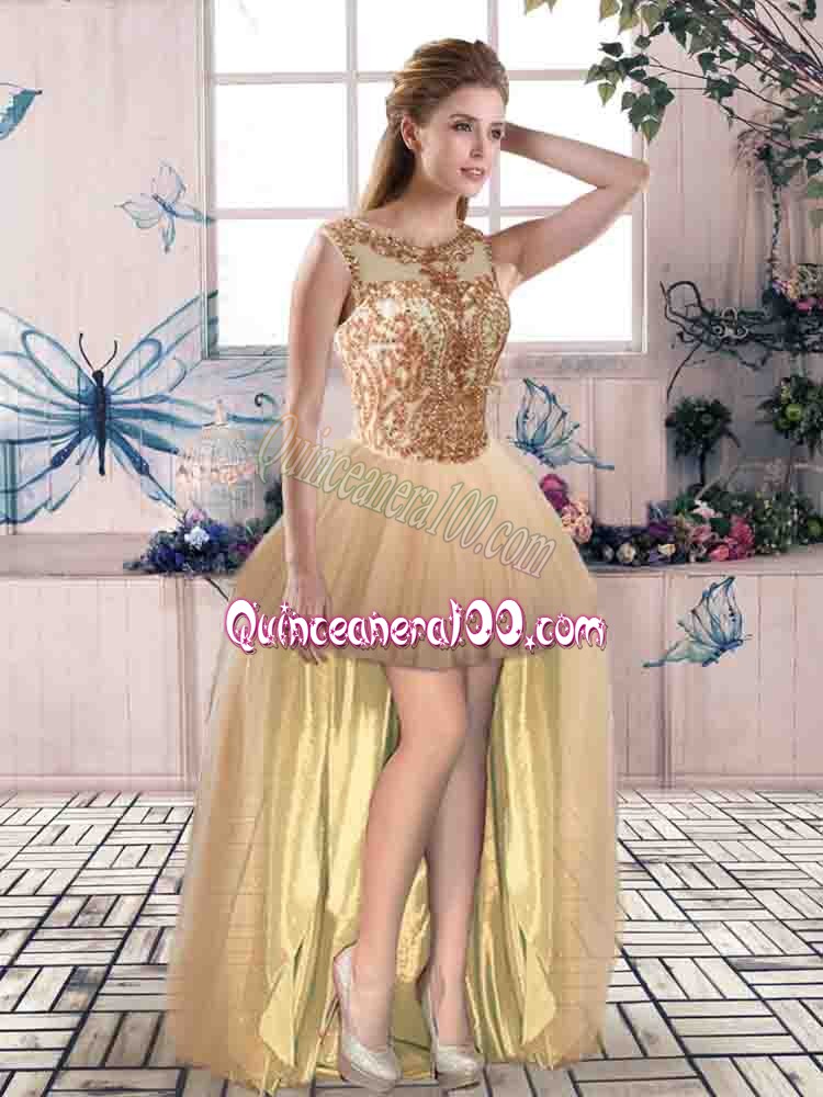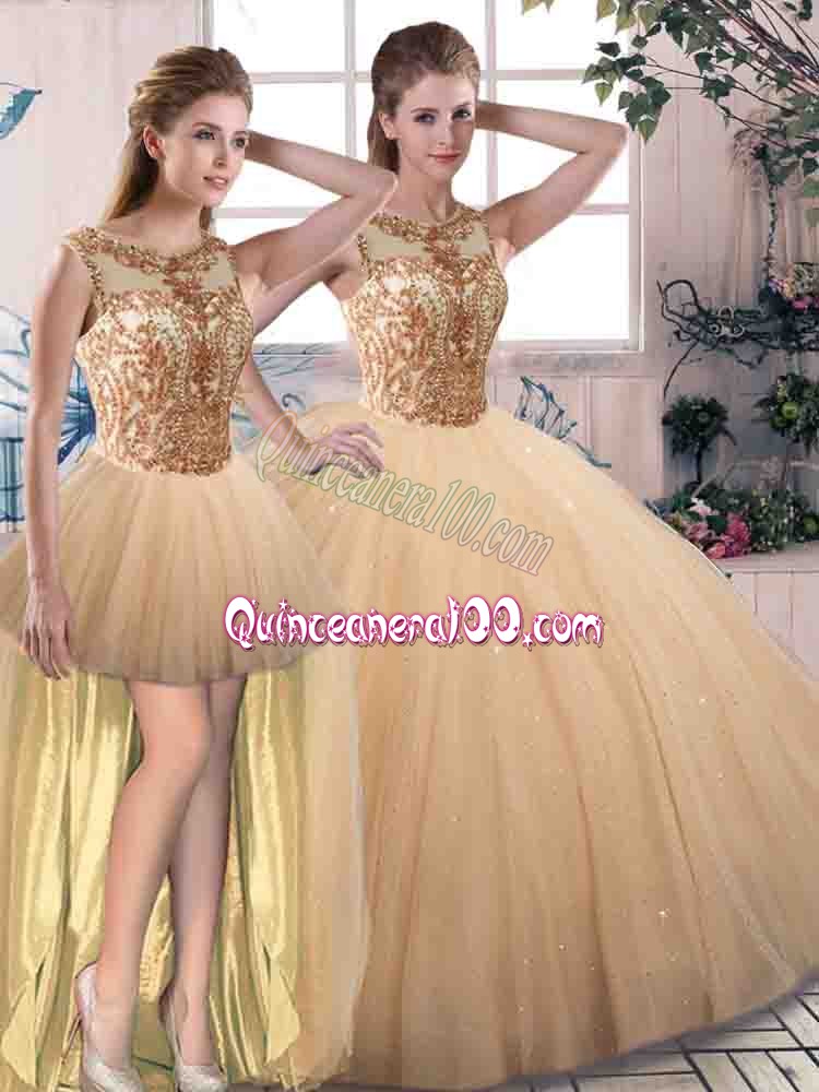 Neckline : ScoopShown Color : GoldSilhouette : Three PiecesSleeve Length : sleevelessHemline : floor lengthBack Detail : Lace upFabric : TulleEmbellishment : BeadingOccasion : Military Ball,Sweet 16,QuinceaneraSeason : Spring,Summer,Fall,Winter