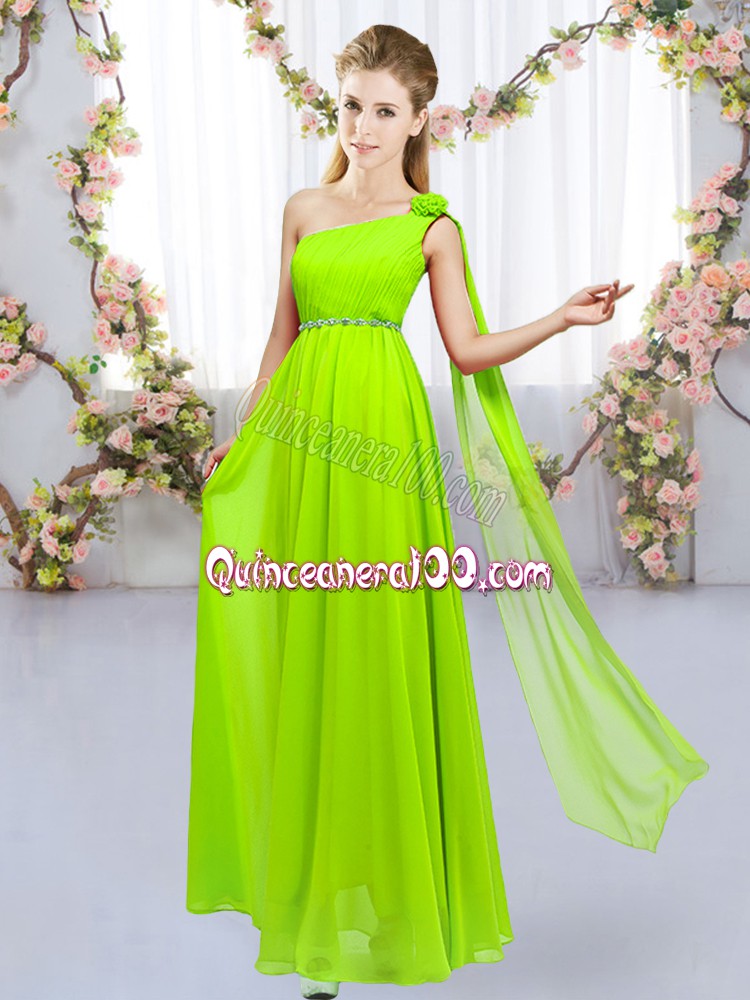 Neckline : One shoulder Shown Color : Yellow Green Silhouette : Empire Sleeve Length : sleeveless Hemline : floor length Back Detail : Lace up Fabric : Chiffon Embellishment : Beading,Hand Made Flower Occasion : Wedding Party Season : Spring,Summer,Fall,Winter