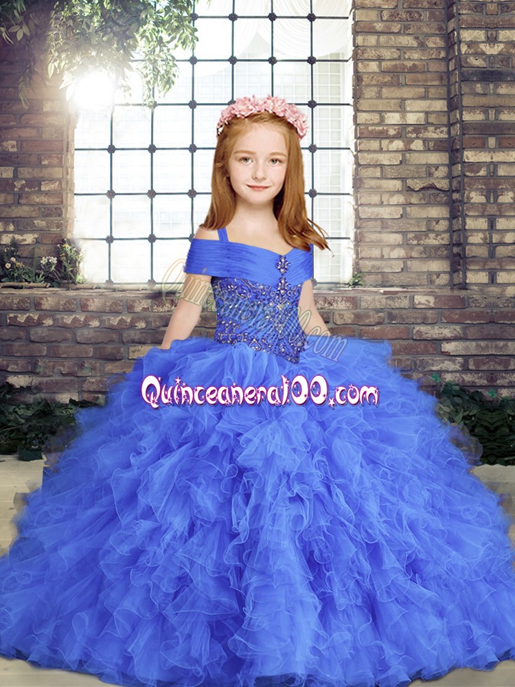 Neckline : StrapsShown Color : BlueSilhouette : Ball GownsSleeve Length : sleevelessHemline : floor lengthBack Detail : Lace upFabric : TulleEmbellishment : Beading,RufflesOccasion : Party,Military Ball,Wedding PartySeason : Spring,Summer,Fall,Winter