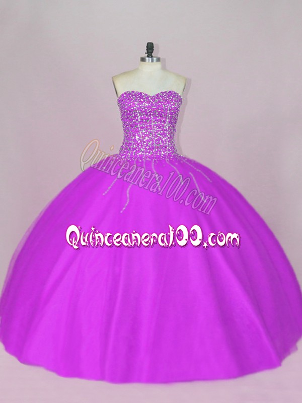 Neckline : SweetheartShown Color : PurpleSilhouette : Ball GownsSleeve Length : sleevelessHemline : floor lengthBack Detail : Lace upFabric : TulleEmbellishment : BeadingOccasion : Sweet 16,QuinceaneraSeason : Spring,Summer