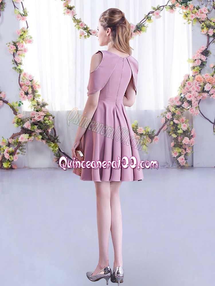 Neckline : ScoopShown Color : LavenderSilhouette : A-lineSleeve Length : half sleevesHemline : mini lengthBack Detail : ZipperFabric : ChiffonEmbellishment : RuchingOccasion : Wedding PartySeason : Spring,Summer,Fall