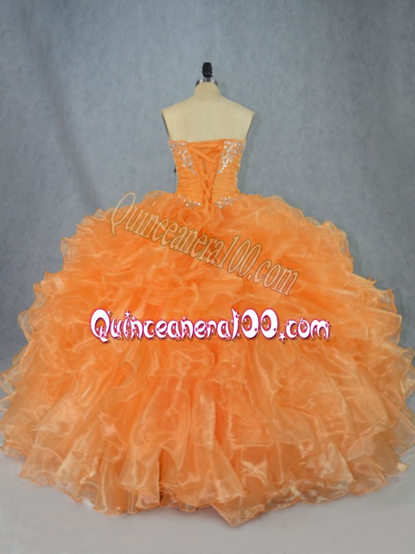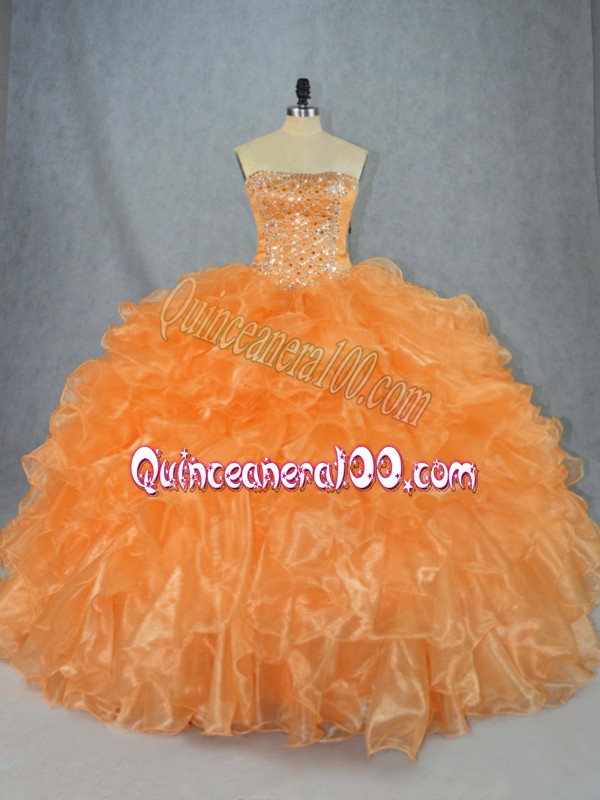 Neckline : StraplessShown Color : OrangeSilhouette : Ball GownsSleeve Length : sleevelessHemline : floor lengthBack Detail : Lace upFabric : OrganzaEmbellishment : Beading,RufflesOccasion : Sweet 16,QuinceaneraSeason : Spring,Summer,Fall,Winter