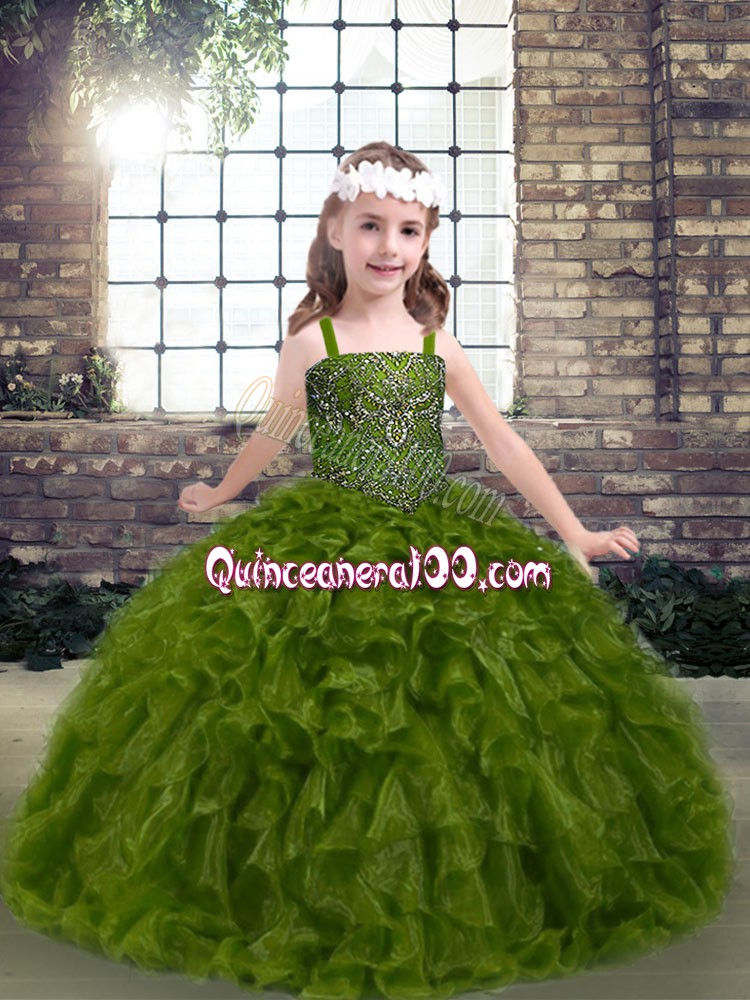 Neckline : StrapsShown Color : Olive GreenSilhouette : Ball GownsSleeve Length : sleevelessHemline : floor lengthBack Detail : Lace upFabric : OrganzaEmbellishment : Beading,RufflesOccasion : Party,Military Ball,Wedding PartySeason : Spring,Summer,Fall,Winter