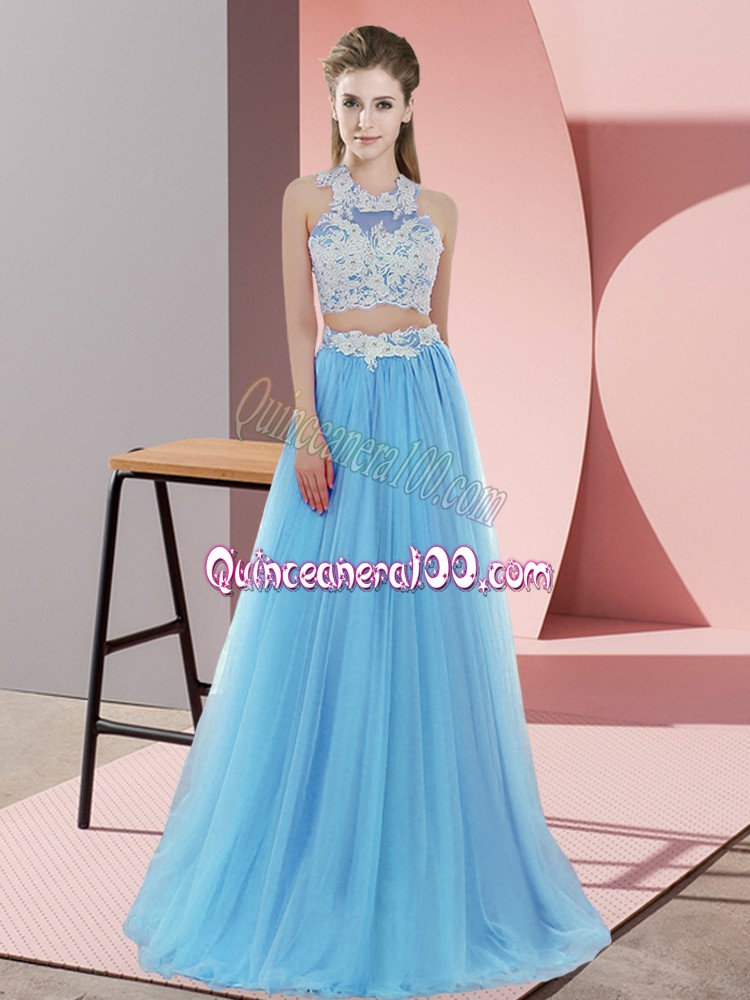 Neckline : Halter topShown Color : Baby BlueSilhouette : Two PiecesSleeve Length : sleevelessHemline : floor lengthBack Detail : ZipperFabric : TulleEmbellishment : LaceOccasion : Wedding PartySeason : Spring,Summer,Fall,Winter