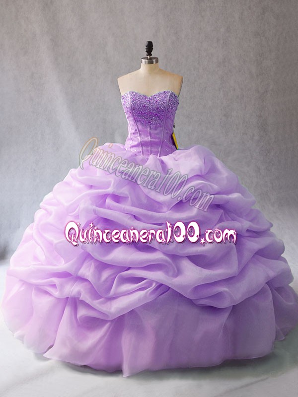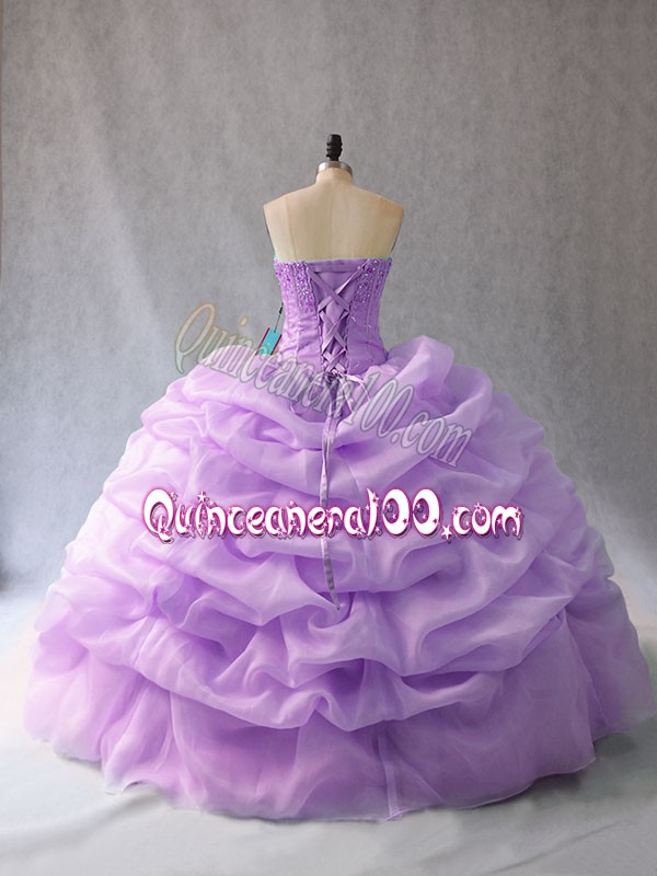 Neckline : SweetheartShown Color : LavenderSilhouette : Ball GownsSleeve Length : sleevelessHemline : floor lengthBack Detail : Lace upFabric : OrganzaEmbellishment : Beading,Pick UpsOccasion : Sweet 16,QuinceaneraSeason : Spring,Summer,Fall,Winter